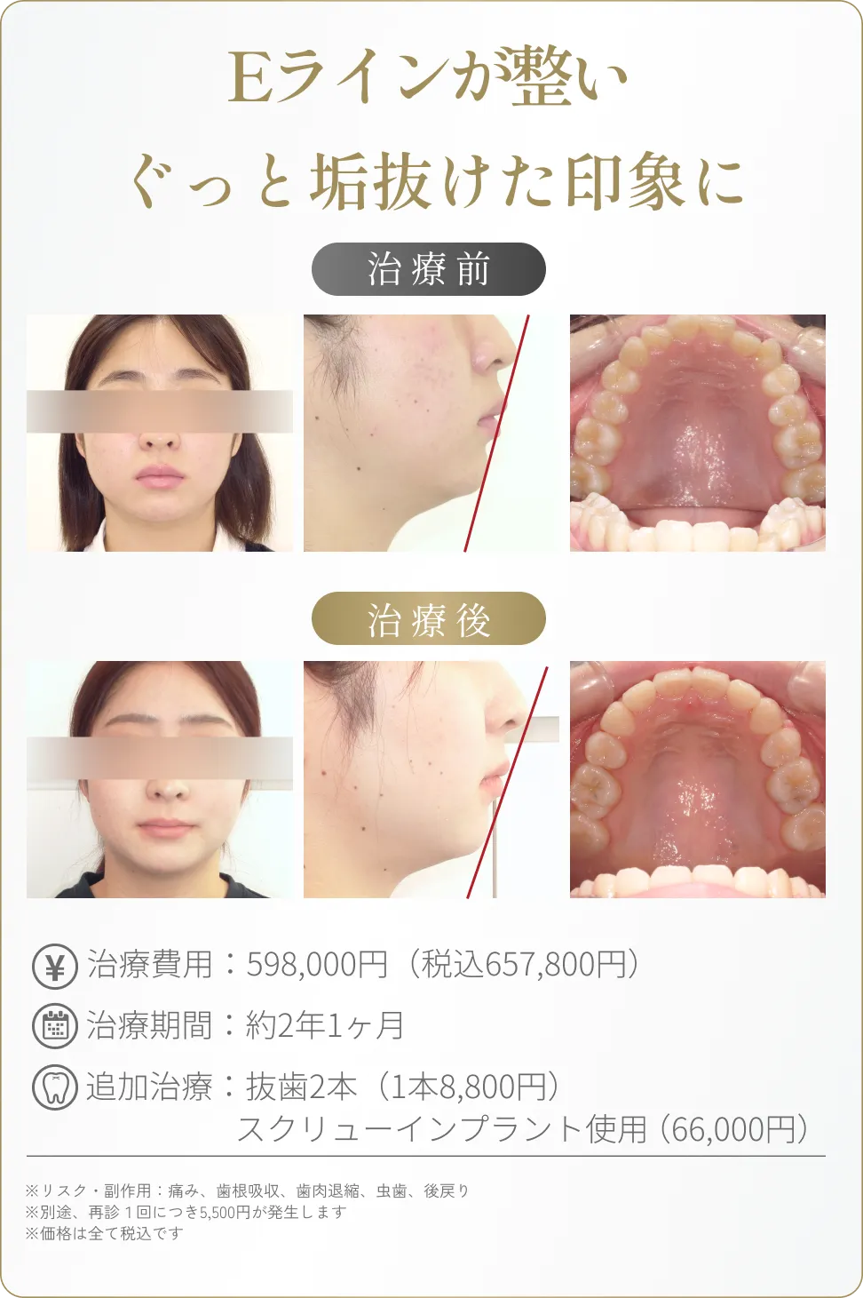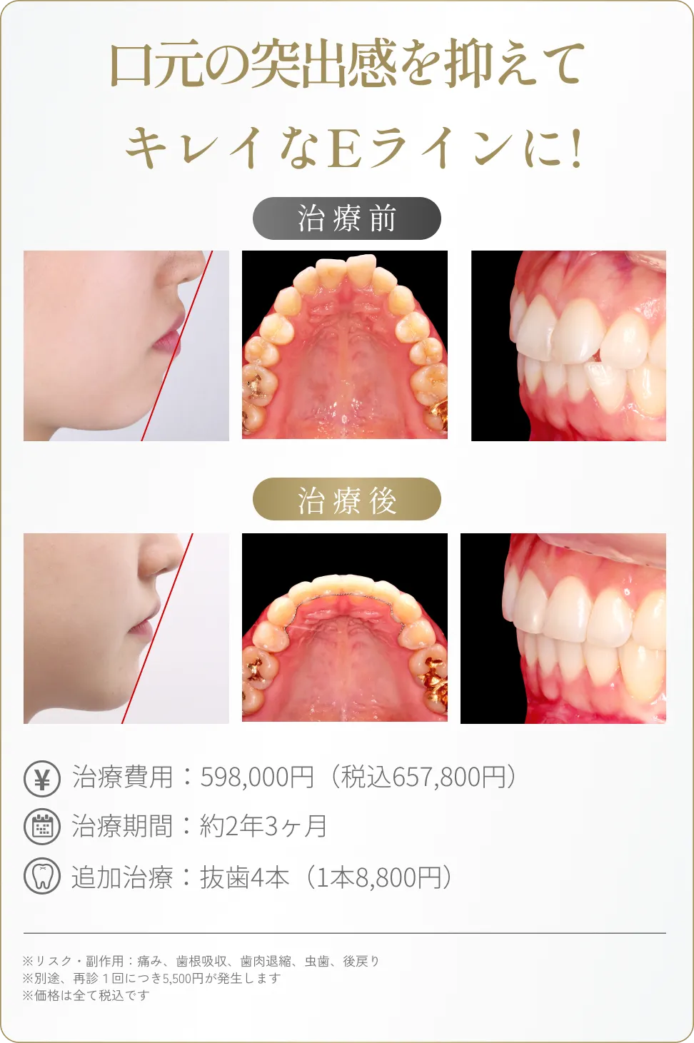 はい、場合によっては必要です。歯の並びを整えるスペースを確保するため、抜歯が必要になることがあります。抜歯することで歯を後方に移動させ、横顔のラインを整えることが可能です。無理に抜歯をせず歯を並べると、Eラインが崩れることもありますので、適切な診断が重要です。