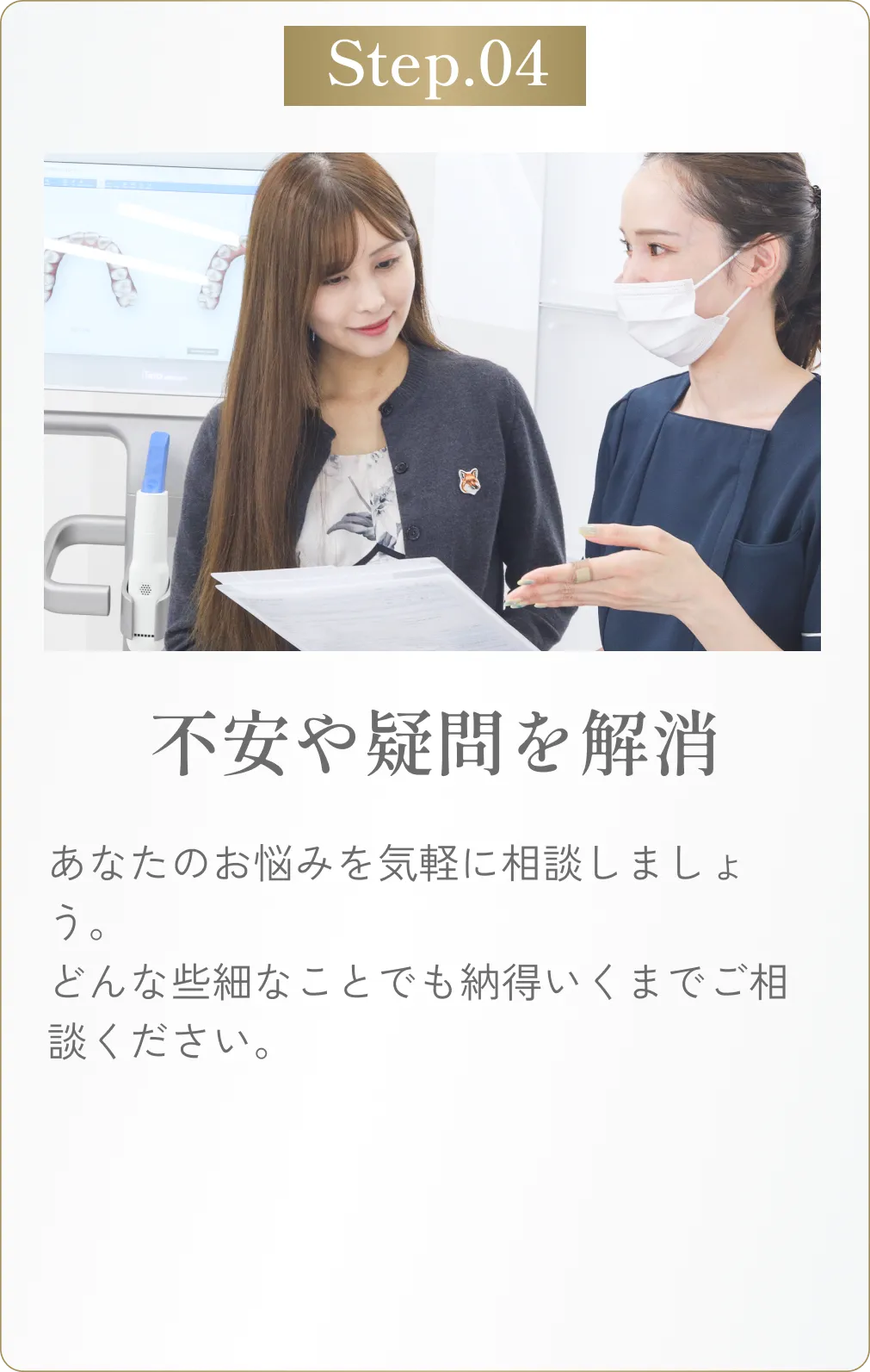 ただし、治療の進行状況や患者様の口腔内の状態によって異なります。詳細は初回検診で歯科医師がご説明いたしますので、まずはお気軽にご相談ください。